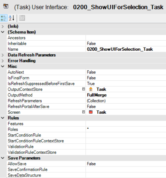 IsFinalFormis set toFalsebecause this is not the last step of the workflow.OutputMethodis set toFullMerge, this is the default setup for a user interface task.Screenis set toTask, reusing the existing Task screen as a list view. Checkboxes will be added later.AllowSaveis set toFalse, as we do not want to display the standard Save button in the workflow screen. Changes will be saved in the following steps.