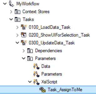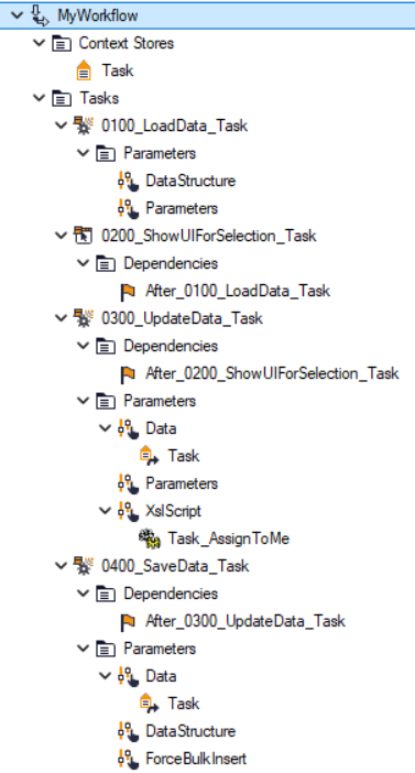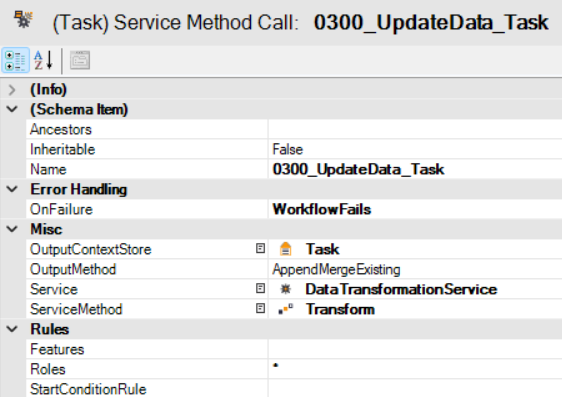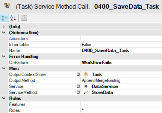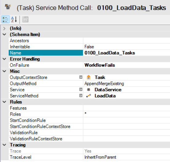 WorkflowFailsonOnFailure, which stops the workflow if any error occurs. OutputContextStoreis set to one of the existing Context stores in the workflow (here “Task”).OutputMethoddetermines how data is written to the output Context store (hereAppendMergeExistingappends new data to existing content;FullMergewould clear existing content and then write new data).Service– to load existing data, you need to useDataService.ServiceMethod– for loading data, use theLoadDatamethod.Roles– we keep the workflow available to all users using the asterisk symbol.TraceLevel– we use the same level as set for the whole workflow.