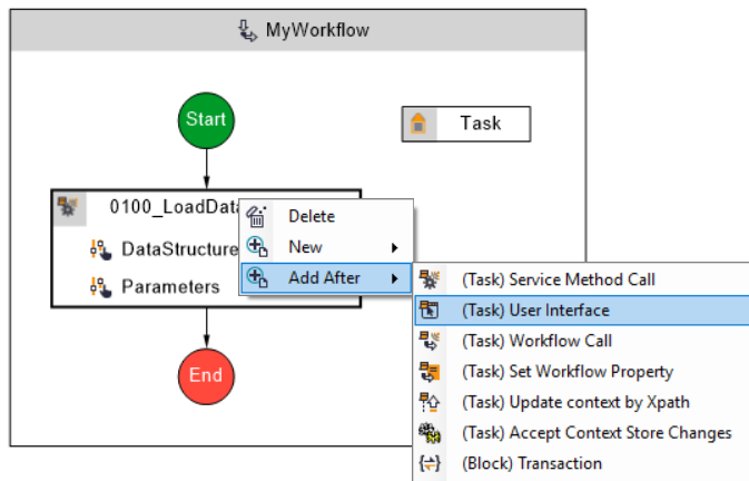 For this purpose, right-click on the first task, select Add After and create a new workflow step of type (Task) User Interface:
