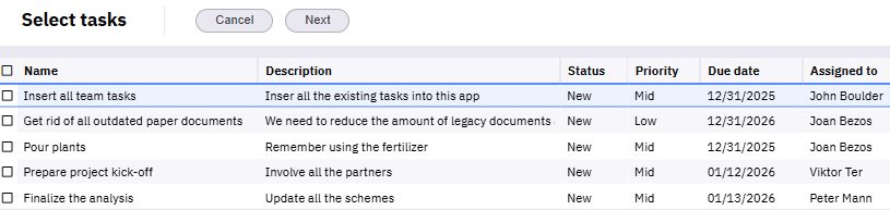 Once all existing tasks are loaded into the Context store, we need to display them to the user and allow them to select which tasks to reassign.