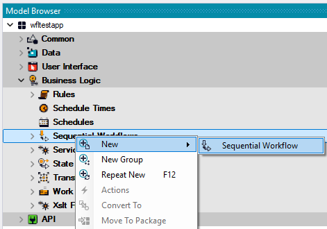 To create the workflow, go to the ORIGAM Architect, open the Model Browser tab, navigate to Business Logic / Sequential Workflows / your package, right-click on your package and choose new Sequential Workflow: