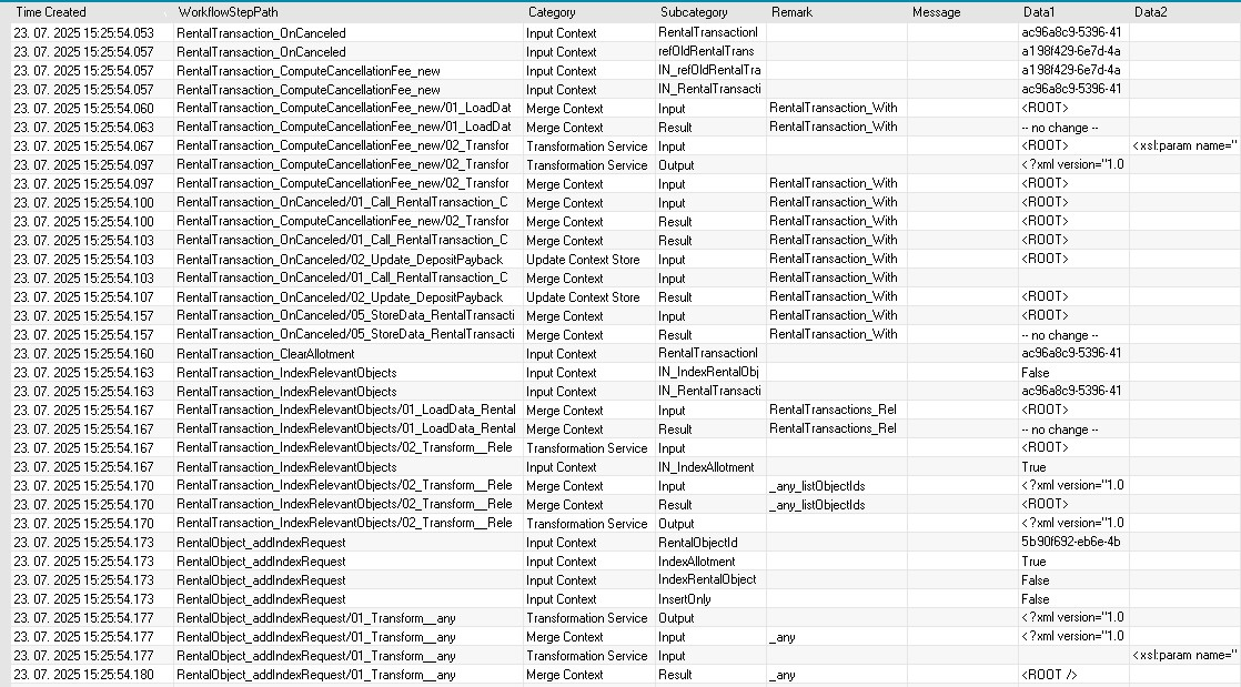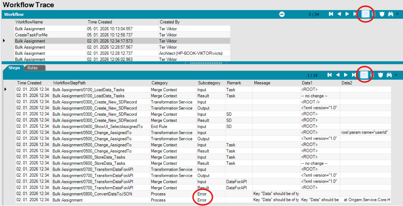 - In the workflow step list in the first picture, note the Subcategory column. This is useful for identifying the first step that ended with an error, which is typically the main point of interest when troubleshooting a workflow.