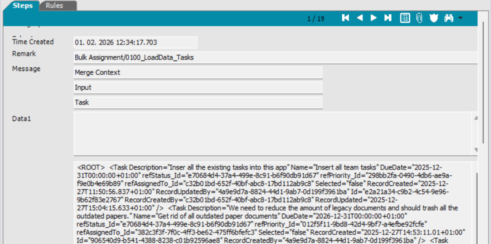 In the workflow step examiner below, you can also switch between a list view, where all workflow steps are visible, and a detail view, where you can inspect input and output data, for example: