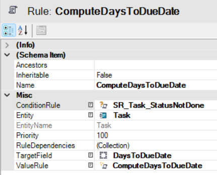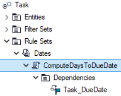 In the previous chapter, you can see that the Simple data rule ComputeDaysToDueDate, used in the Task entity, has an associated Condition rule that determines whether the rule should be applied.