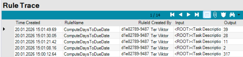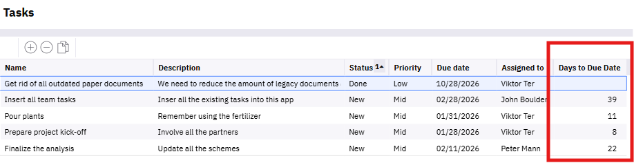 Using this rule and the corresponding data structure, we can, for example, add a column named “Days to Due Date” to the Task data view:
