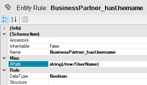 As an example, consider the entity rule BusinessPartner_hasUsername defined for the system entity Business Partner. It can be found in the Security package and simply verifies that the UserName field is filled: