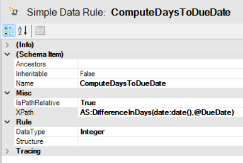 IsPathRelativemeans that you can use a path starting from the current XML node and do not need to start withROOTXPathcontains the formula written in valid XPath; in this case, ORIGAM’s custom functionAS:DifferenceInDaysis usedDataTypeis set to Integer, as the function returns a whole number; the data type has to be of the same type as the field that is filled with the calculation